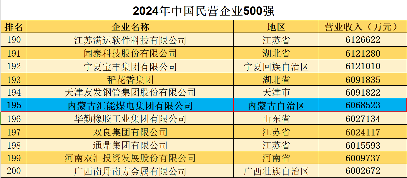 10 月 12 日,全國(guó)工商聯(lián)發(fā)布 2024 中國(guó)民營(yíng)企業(yè) 500 強(qiáng)報(bào)告并公布榜單。匯能控股集團(tuán)有限公司(原內(nèi)蒙古匯能煤電集團(tuán)有限公司)位列榜單195位,較2023年的240位前進(jìn)44位。